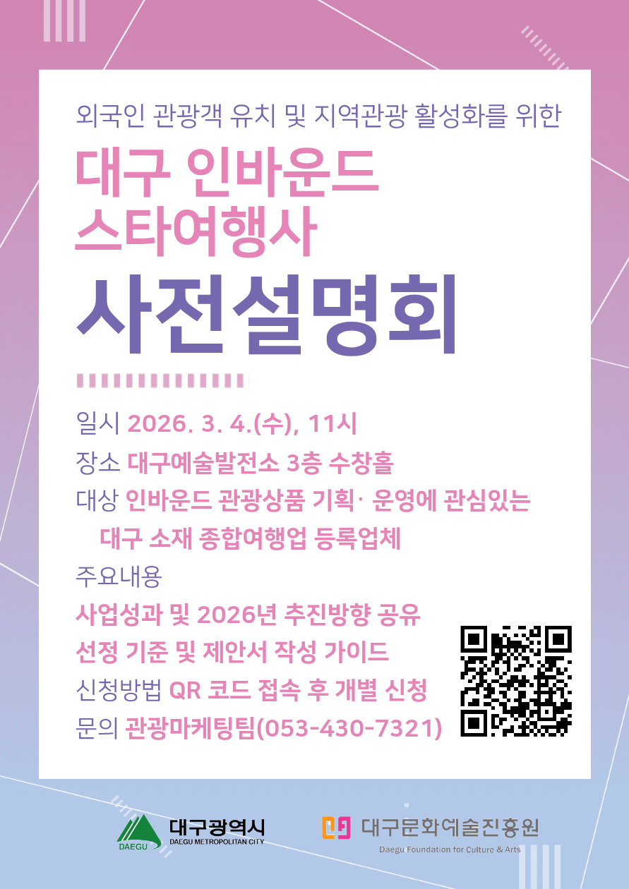 대구광역시와 대구문화예술진흥원 관광본부에서 지역 인바운드 관광상품 경쟁력 강화를 위한 「2026 대구 인바운드 스타여행사 육성사업 사전설명회」를 다음과 같이 개최하오니, 관내 여행업체가 참여할 수 있도록 홍보 협조를 요청드립니다.